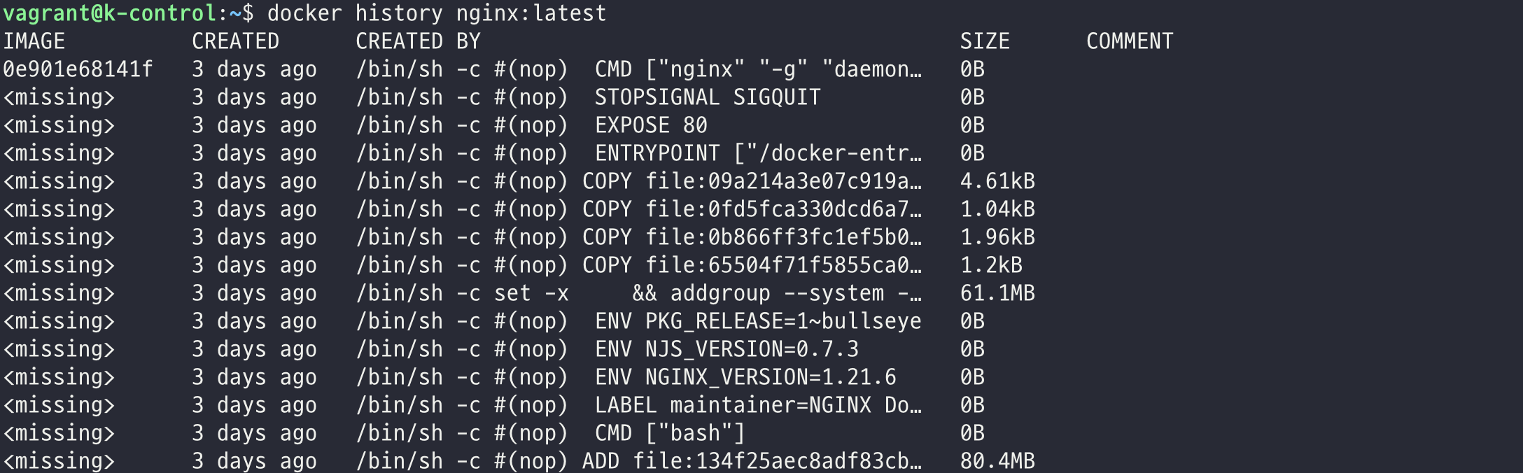 실행 결과에 42c077c10790: Already exists 라고 나오는데 42c077c10790 레이어가 이미 존재한다는 뜻이다. 앞에서 내려받은 nginx:latest 이미지에 해당 레이어가 있기 때문이다. 따라서 이 부분을 내려받지 않고 재사용한다.