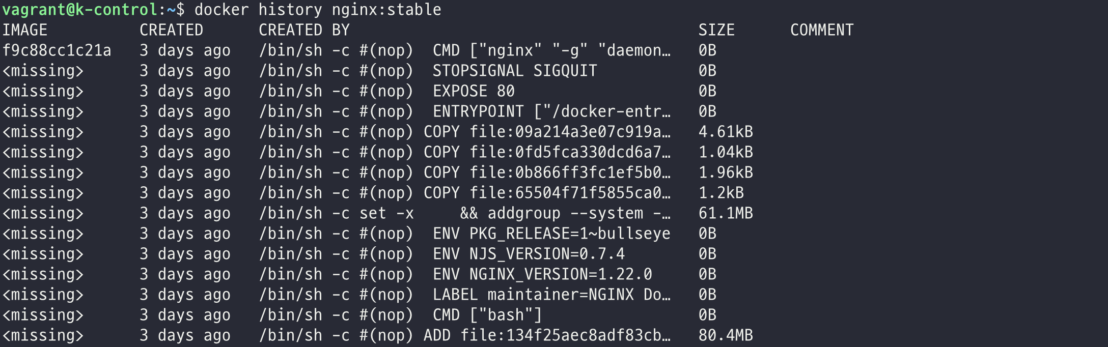 이처럼 도커로 작성된 컨테이너는 레이어를 재사용하기 때문에 여러 이미지를 내려받더라도 디스크 용량을 효율적으로 사용할 수 있다. 참고로 docker history에서 나오는 내용들은 도커 컨테이너 이미지 자체를 만드는 명령을 보여주는것이다.
