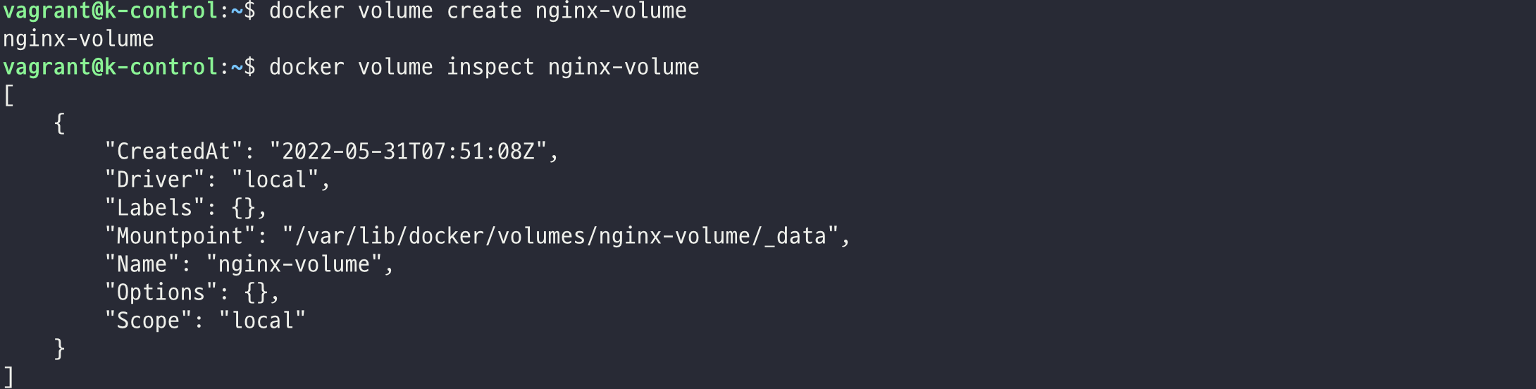 Mountpoint 행의 /var/lib/docker/volumes/nginx-volume/_data/ 디렉터리가 볼륨 디렉터리임으로 확인할 수 있다. 컨테이너 내부와 연결할 때 전체 디렉토리 경로를 사용하지 않고 nginx-volume이라는 볼륨 이름만으로 간편하게 연결할 수 있다.