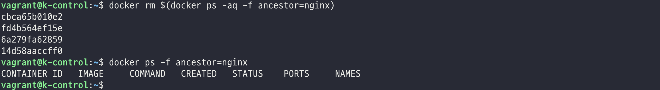 $ docker rm $(docker ps -aq -f ancestor=nginx)