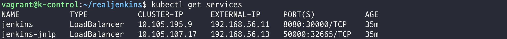 젠킨스를 직접 접속해서 살펴보기에 앞서 현재 설치된 젠킨스의 구조를 간단히 살펴보자. 젠킨스 컨트롤러는 마스터 노드에 설치했지만 젠킨스 에이전트는 필요시에 생성되고 작업을 마치면 삭제되는 임시적인 구조를 가진다. 따라서 젠킨스 에이전트 작업 내용들은 삭제 전에 젠킨스 컨트롤러에 저장되어야 하며, 이를 위해 젠킨스 에이전트 서비스가 항상 동작하고 있다. kubectl get service 명령으로 현재 젠킨스 에이전트 서비스를 확인할 수 있다.