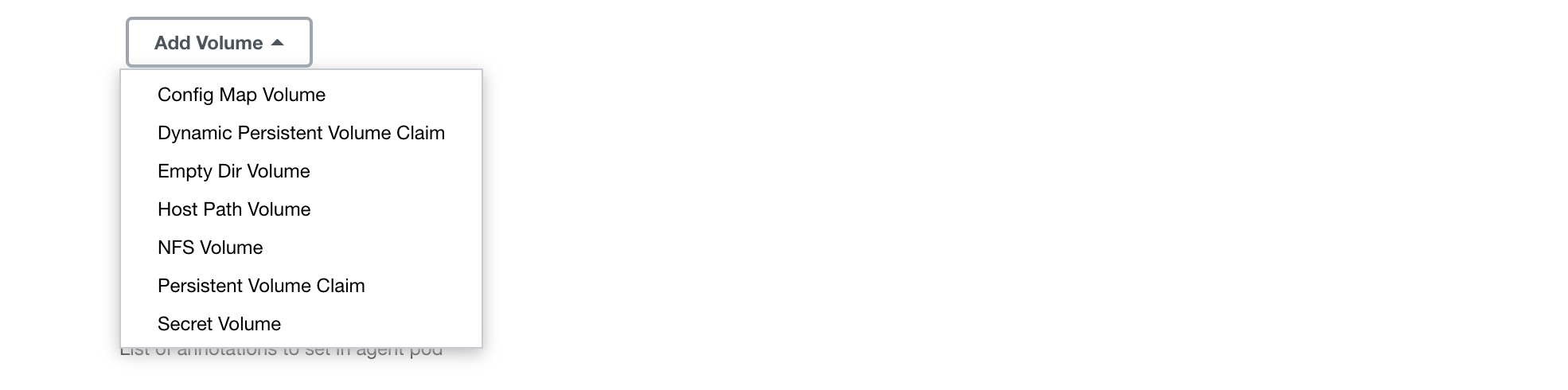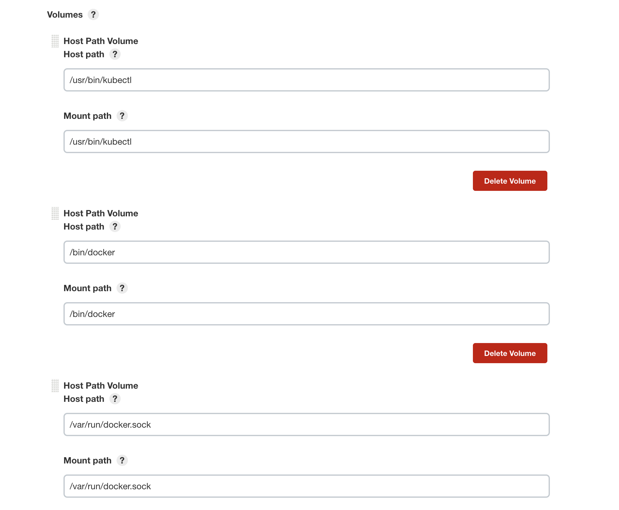 다음으로 빌드 작업 중 호스트에 설치된 명령어를 파드 내부에서 사용하기 위한 Volumes를 설정하는 메뉴를 살펴보자.