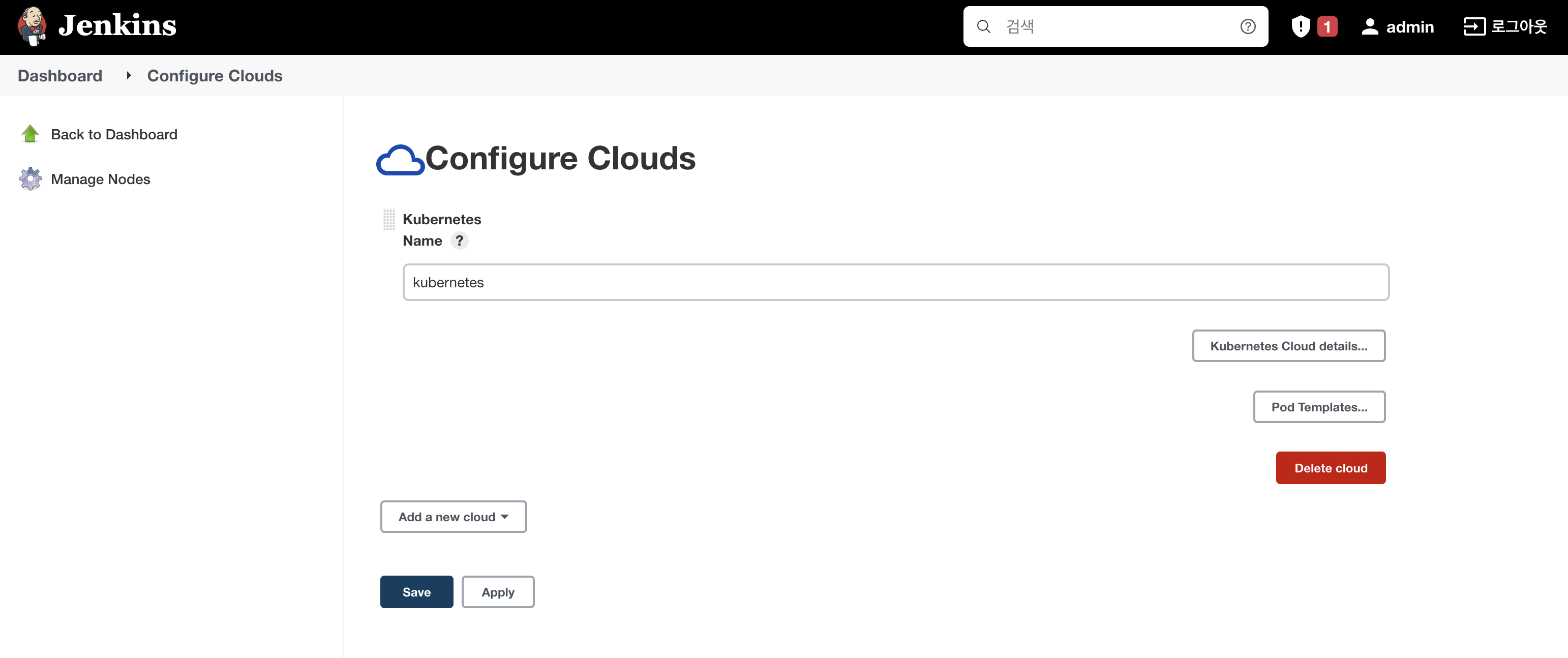 - 클라우드 환경 기반의 에이전트를 설정할 때 필요하다. 쿠버네티스 위에 설치된 젠킨스의 에이전트에 관한 설정도 이 메뉴에서 설정할 수 있다.