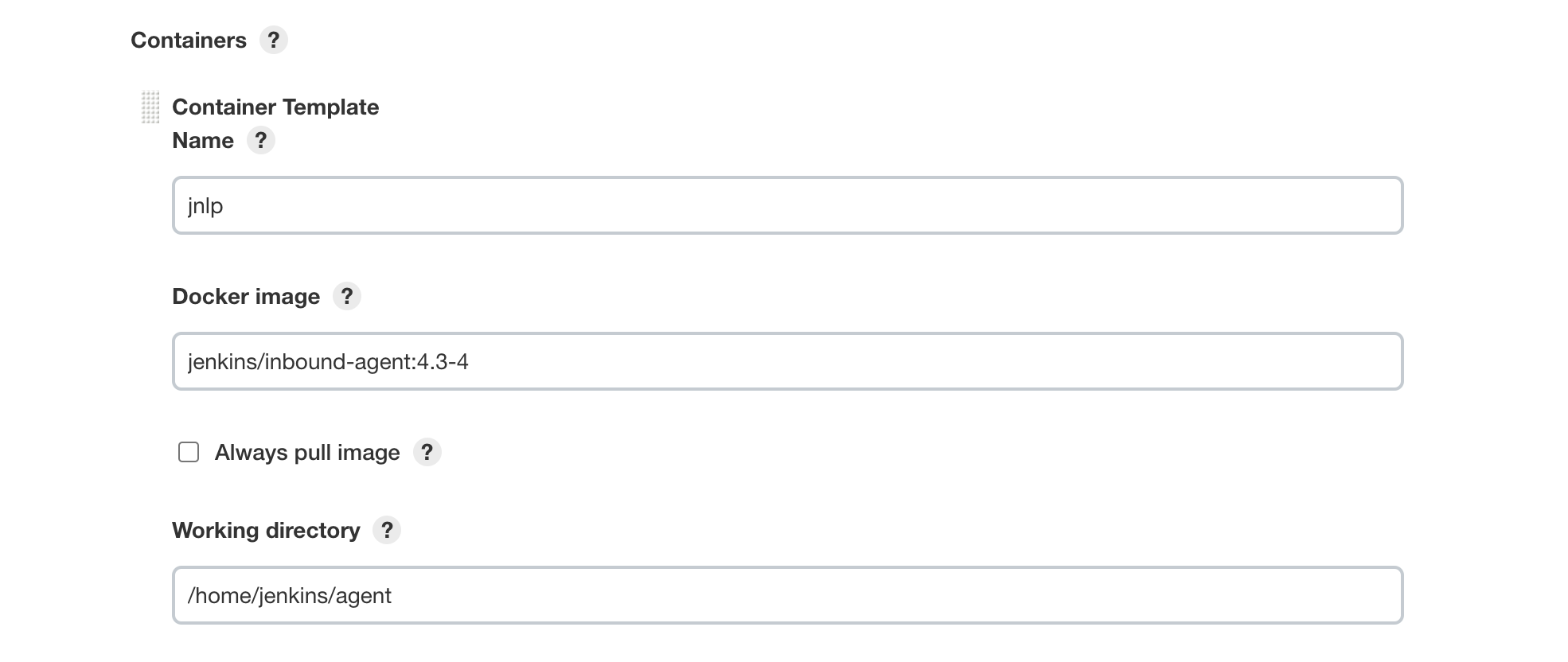 - 컨테이너에서 사용할 이미지를 지정한다. 이미지는 기본 설정대로 젠킨스에서 제공하는 inbound-agent:4.3-4를 사용한다.