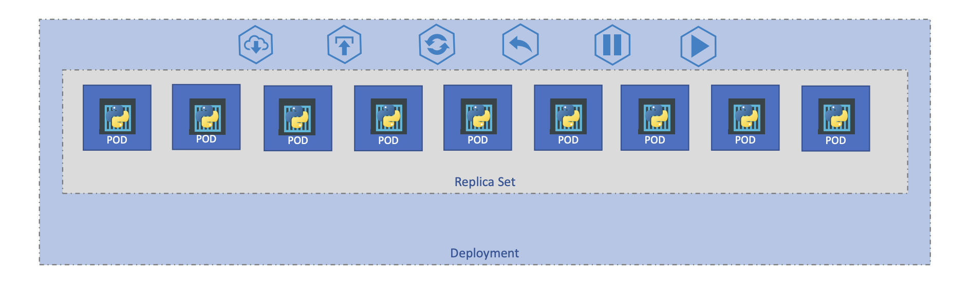 이러한 모든 기능은 kubernetes 배포 환경에서 사용할 수 있다. 지금까지 이 과정은 웹 애플리케이션과 같은 애플리케이션의 단일 인스턴스를 배포하는 POD에 대한 설명이다. 이 경우에는 각 컨테이너는 POD에 캡슐화된다. 이러한 여러 POD는 Controller 또는 Replica Set의 복제를 사용하여 배포된다. 그런 다음 계층에서 더 높은 수준의 있는 Kubernetes 객체인 Deployment가 제공된다.