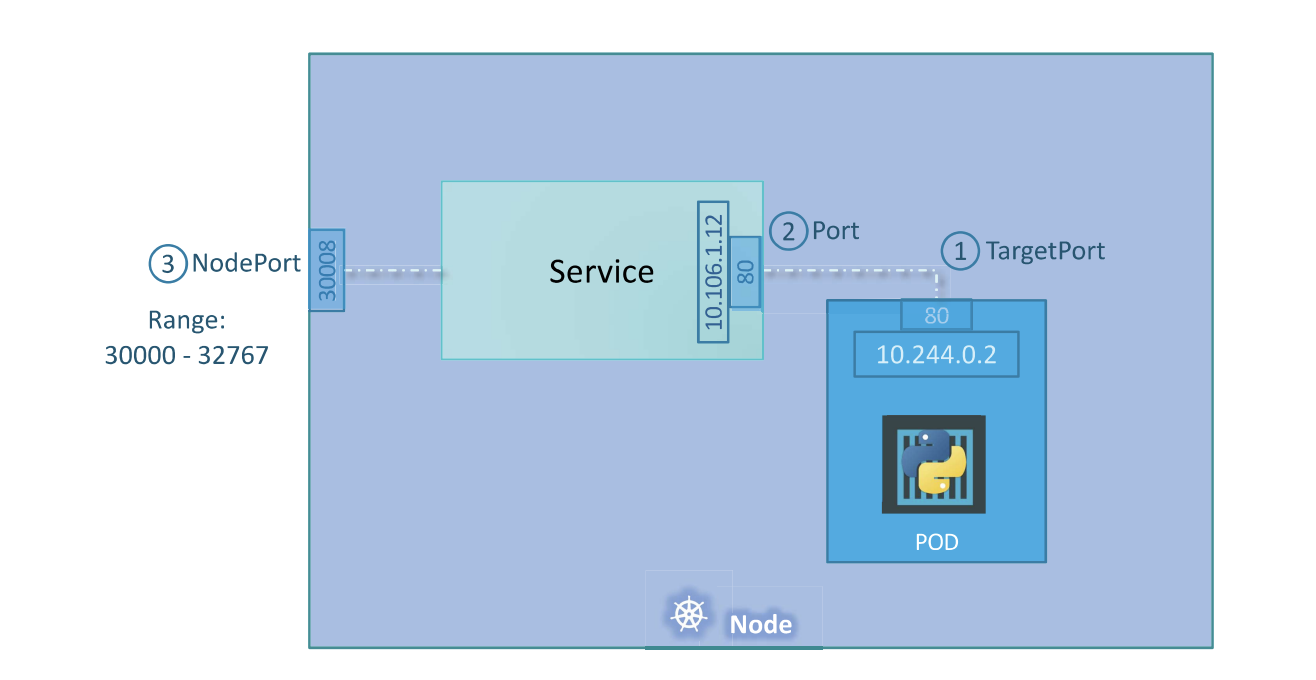 여기서 Kubernetes 서비스가 시작된다. Kubernetes Services는 이전에 작업했던 Pod, Replicaset 또는 Deployment와 같은 객체이다. 사용 사례 중 하나는 노드의 포트를 수신 대기하고 해당 포트의 요청을 웹 애플리케이션을 실행하는 Pod의 포트로 전달하는 것이다.