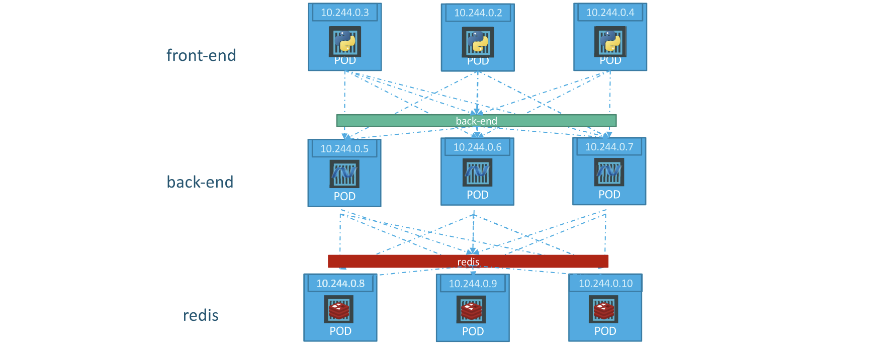 웹 프런트 엔드 서버는 백엔드 서버와 통신해야 하며 백엔드 작업자는 데이터베이스와 Redis 서비스 등에 연결해야 한다. 그렇다면 애플리케이션의 이러한 서비스 또는 계층 간에 연결을 설정하는 올바른 방법은 무엇일까?