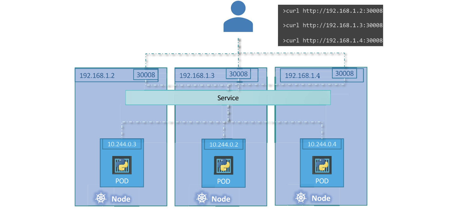 이 경우 클러스터의 개별 노드에 있는 포드에 웹 애플리케이션이 있다. 추가 구성 작업 없이 서비스를 생성하면 클러스터의 모든 노드에 걸쳐 있는 서비스가 자동으로 생성되고 클러스터 내의 모든 노드의 동일한 NodePort 에 대상 포트를 매핑하여 클러스터에 있는 모든 노드의 IP를 사용하여 동일한 포트를 사용하여 애플리케이션에 액세스할 수 있다. 이 경우 30008 포트번호이다. 이러한 노드중 하나의 IP를 사용하여 볼 수 있다. 그리고 동일한 포트로 컬링을 시도하고 있으며 클러스터의 모든 노드에서 동일한 포트를 사용할 수 있다.