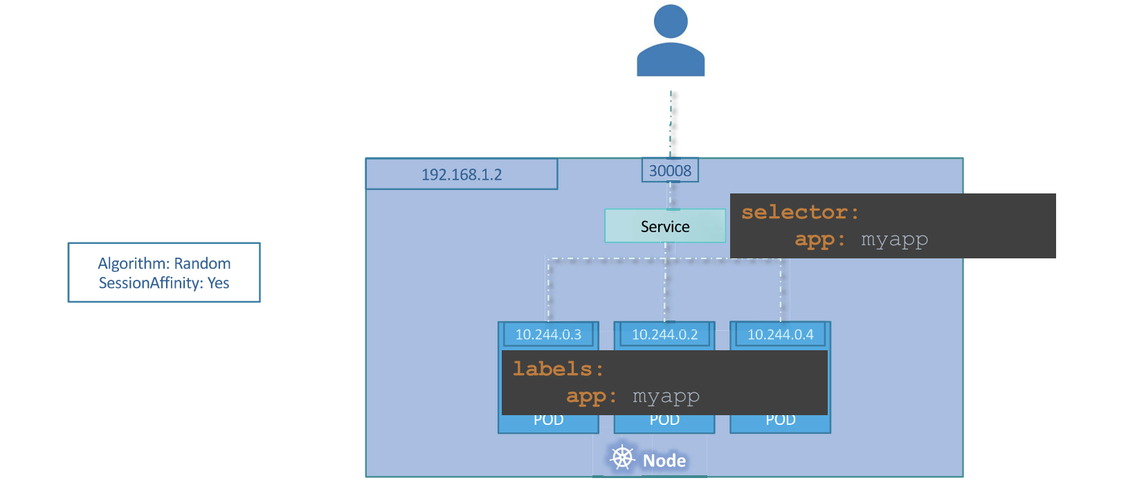 단일 포드에 매핑된 서비스에 대해 지금까지 설명했다. 하지만 항상 그런 것은 아니다. Pod가 여러 개일 때는 어떻게 할까? 프로덕션 환경에서 이 경우 고가용성 및 로드 밸런싱을 위해 실행 중인 웹 응용 프로그램의 여러 인스턴스가 있다. 웹 애플리케이션을 실행하는 유사한 Pod가 여러 개 있으며, 모두 key가 myapp인 동일한 label을 가지고 있으며, 서비스를 생성하는 동안 동일한 label이 selector로 사용된다. 따라서 서비스가 생성되면 label과 일치하는 Pod를 찾고 그 중 세 개를 찾는다.