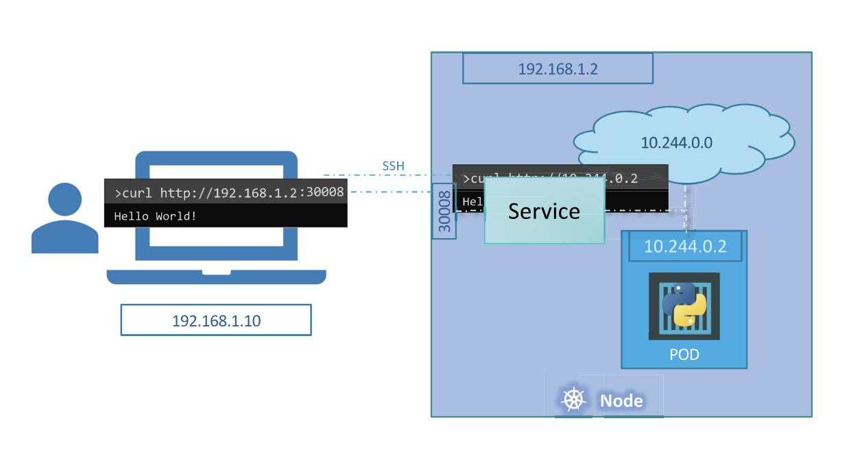 첫번째, 만약 우리가 192.168.1.2에 있는 쿠버네티스 노드로 SSH를 한다면, 우리는 curl을 하거나 만약 노드가 GUI를 가지고 있다면, 우리는 http://10.244.0.2에 접근하고 이어 브라우저에서 웹 페이지를 볼 수 있을 것이다. 하지만 이것은 Kubernetes 노드 안에서 나온 것이고 그것은 정말로 원하는 것이 아니다. 노드에 SSH할 필요 없이 단순히 쿠버네티스 노드의 IP에 액세스하여 내 노트북에서 웹 서버에 액세스할 수 있기를 원한다. 따라서 중간에 노트북에서 노드를 통해 웹 컨테이너를 실행하는 Pod에 노드에 요청을 매핑하는 데 도움이 되는 무언가가 필요하다.