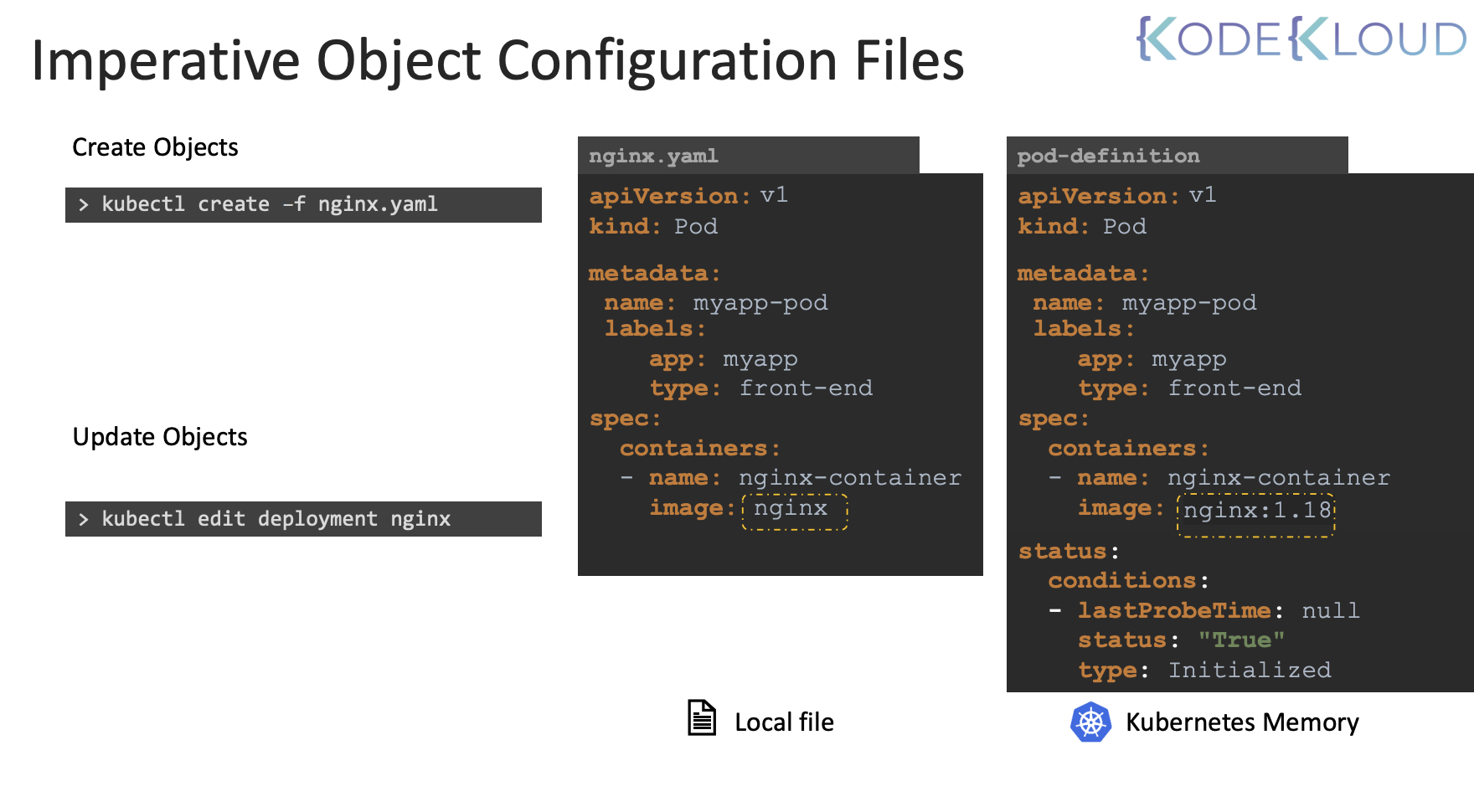 따라서 이 명령을 실행하면 개체를 생성하는데 사용한 것과 유사한 YAML 정의 파일이 열린다. 그러나 여기에 표시된 상태 필드 같은 추가 필드가 있다. 포드 상태를 저장하는 데 사용된다. 개체를 만드는 데 사용한 파일이 아니고 이것은 쿠버네티스 메모리 내의 유사한 포드 정의 파일이다. 이 파일을 변경한 후 저장하고 종료하면 해당 변경 사항이 라이브러리에 적용된다. 그러나 라이브 개체와 로컬에 있는 정의 파일에는 차이가 있다. edit 명령을 사용하여 변경한 내용은 변경 내용이 적용된 후 아무 곳에도 실제로 기록되지 않는다. 로컬 정의 파일에는 실제로 이전 이미지 이름이 포함되어 있다.