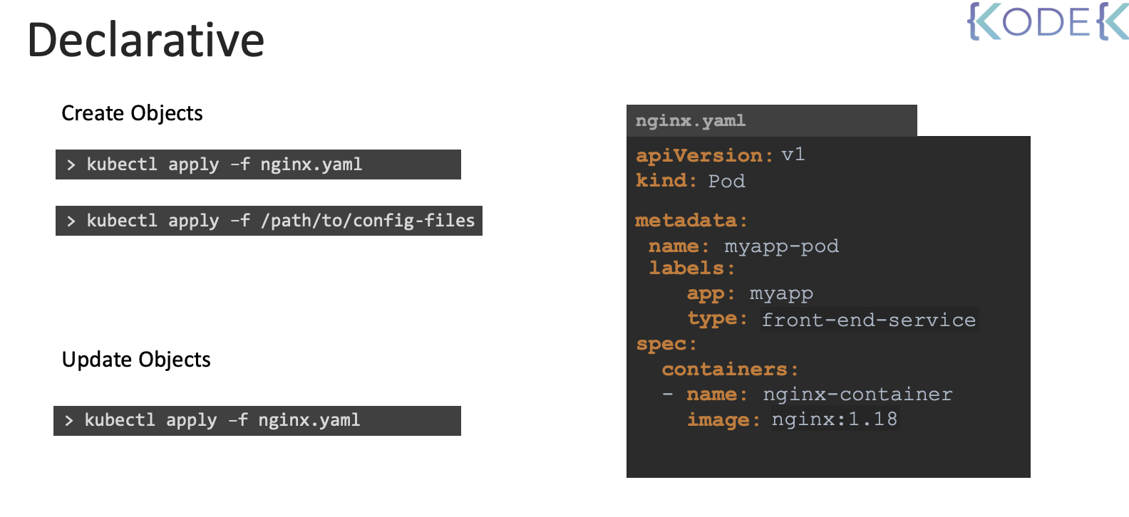 선언적 접근 방식은 kubectl apply 명령으로 Kubernetes 클러스터에서 응용 프로그램과 서비스의 상태를 정의하는 파일 집합을 만드는 것이다. Kubernetes는 구성 파일을 읽고 인프라를 정의한 상태로 만들기 위해 무엇을 해야 하는지 스스로 결정할 수 있어야 한다. 따라서 선언적 접근 방식에서는 kubectl apply를 실행하여 객체를 생성, 업데이트 또는 삭제하기 위한 명령을 적용한다. kubectl apply 명령은 기존 구성을 살펴보고 시스템에 어떤 변경이 필요한지 파악한다.