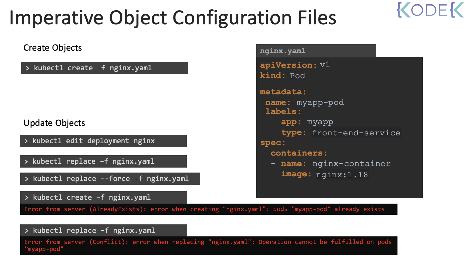 그러나 더 나은 접근 방식은 먼저 필요한 변경 사항이 있는 개체 구성 파일의 로컬 버전을 편집하는 것이다. 즉, 여기서 이미지 이름을 업데이트한 다음 kubectl replace 명령을 실행하여 개체를 업데이트한다. 이후 변경 사항은 기록되고 변경 검토 프로세스의 일부로 추적될 수 있다. 때때로 개체를 완전히 삭제하고 다시 생성해야 하고 싶다면, 이러한 경우 다음과 같은 force 옵션을 사용하여 동일한 명령을 실행할 수 있다. 하지만 이것은 여전히 명령적인 접근 방식이다. 왜냐하면 당신은 여전히 쿠버네티스에게 이 객체들을 만들거나 업데이트하는 방법을 가르치고 있기 때문이다. 먼저 코드를 실행하여 명령을 만들고 개체를 만든 다음 replace 명령을 실행하여 개체를 바꾸거나 delete 명령을 실행하여 개체를 삭제한다. create 명령을 실행하면 어떻게 될까? 개체가 이미 있으면 pod가 이미 있다는 오류와 함께 실패한다. 개체를 업데이트할 때는 항상 replace 명령을 실행하기 전에 개체가 먼저 존재하는지 확인해야 한다. 개체가 존재하지 않으면 오류 메시지와 함께 replace 명령이 실패한다. 따라서 변경하기 전에 항상 현재 구성을 숙지하고 제대로 작동하는지 확인해야 하기 때문에 관리자로서 명령적인 접근 방식은 매우 부담이 된다.