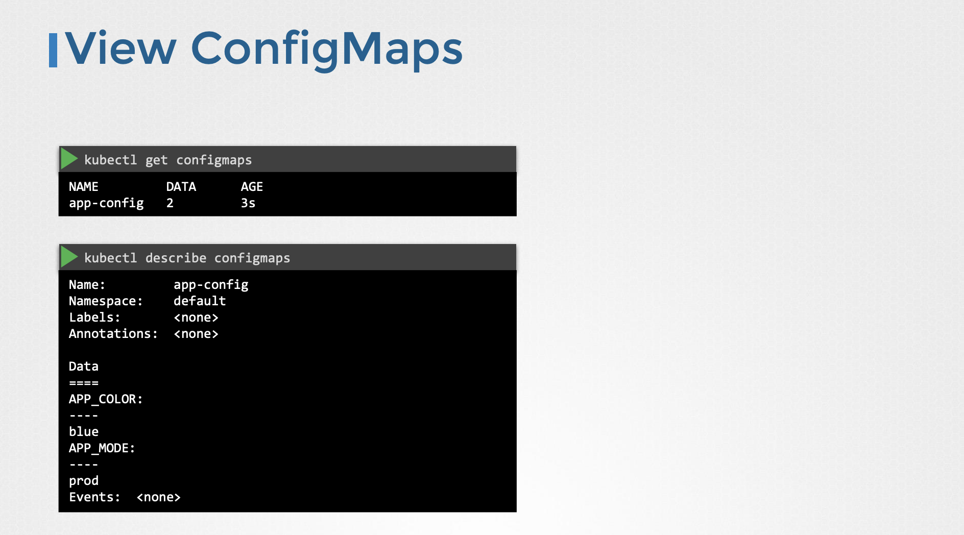 구성 맵을 보려면 kubectl get configmaps 명령을 실행한다. app- config라는 이름의 새로 생성된 구성 맵이 나열된다. kubectl describe configmaps 명령은 데이터 섹션 아래에 구성 데이터를 나열한다.