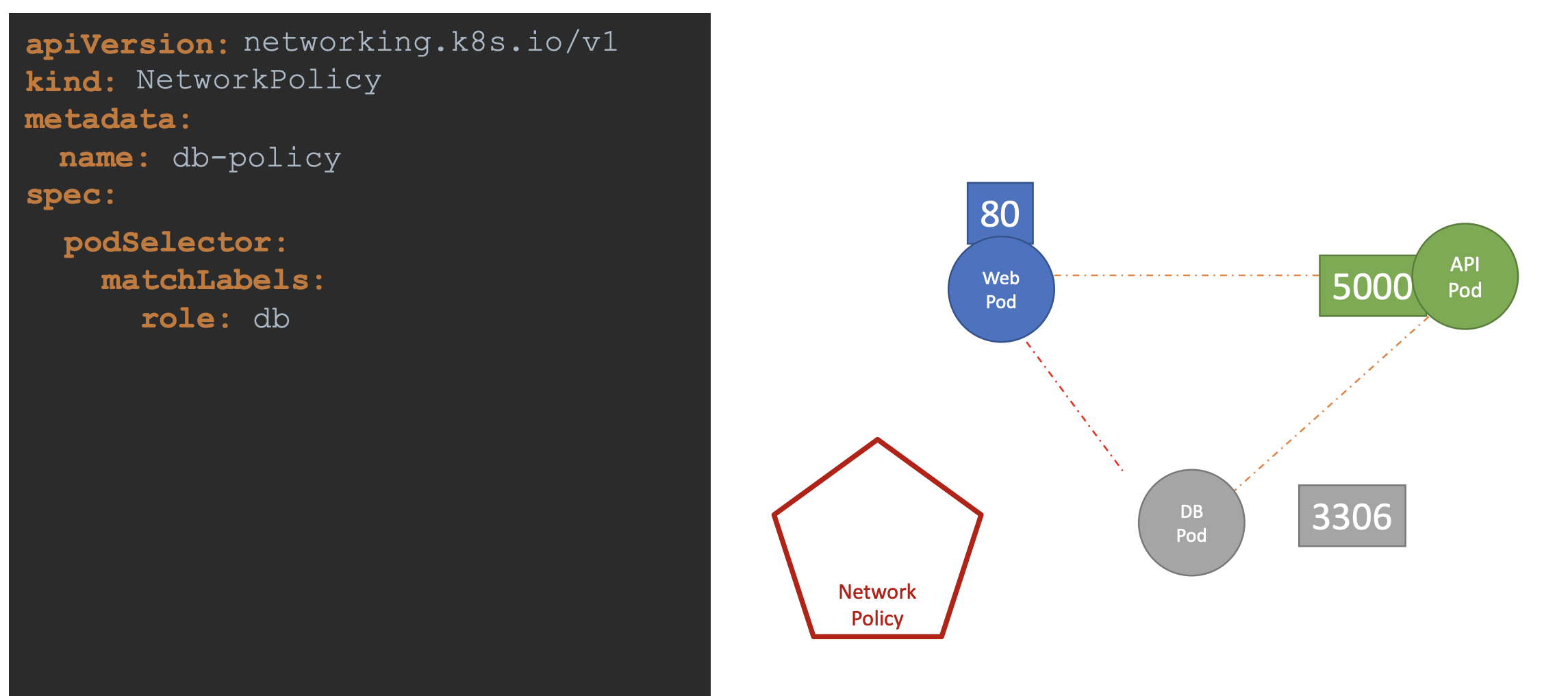 데이터베이스 파드(DB Pod)를 다른 pod에서 접근할 수 없도록 보호하려고 한다.하지만 API Pod에서의 접근은 허용한다.기본적으로 kubernetes는 모든 트래픽을 허용하지만 데이터베이스 파드로 들어오고 나가는 모든것을 차단하고 싶다. 그래서 네트워크 정책을 생성한다. 우리는 그것을 DB 정책이라고 부른다. 첫번째 단계는 보호하려는 pod에 네트워크 정책을 연결하는것이다. (label, selector 이용)