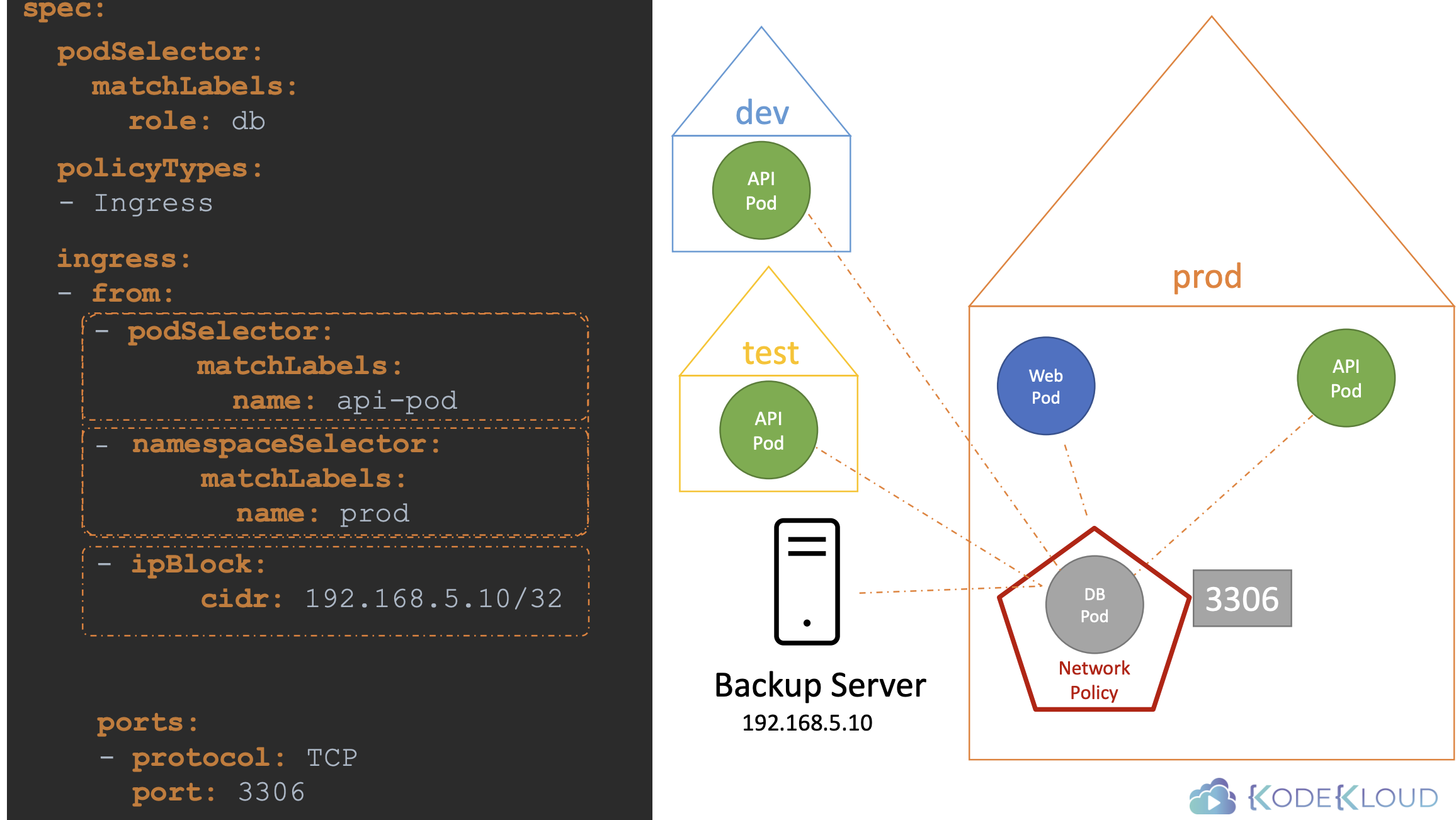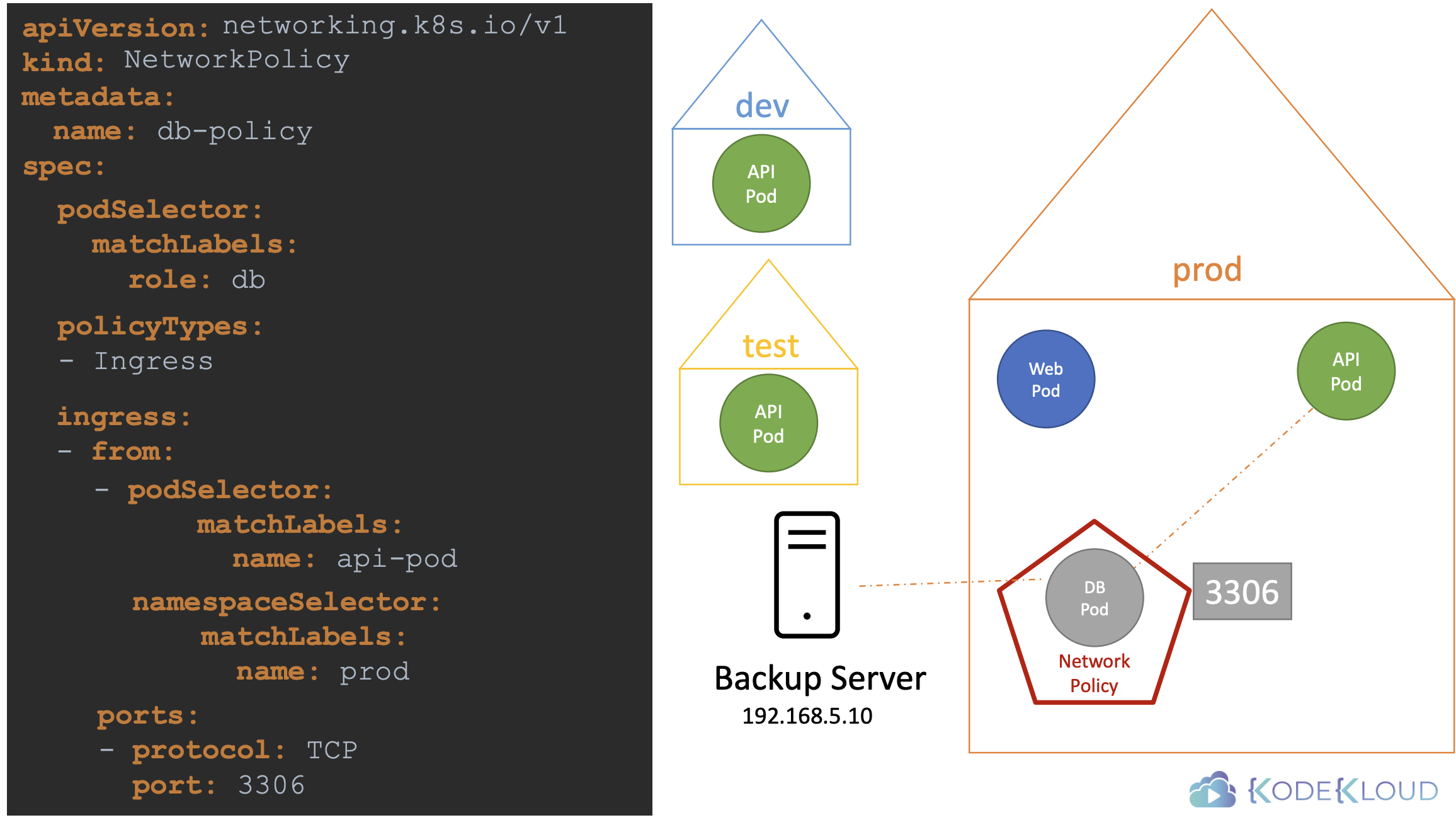 그러나 백업 서버의 IP 주소는 알고 있으며 이 주소는 192.168.5.10이다. 특정 IP 주소에서 발생하는 트래픽을 허용하도록 네트워크 정책을 구성할 수 있다. 이를 위해 IP 블록 정의로 알려진 새로운 유형의 정의를 추가합니다. IpBlock을 사용하면 트래픽이 데이터베이스 포드에 도달하도록 허용할 수 있는 IP 주소 범위를 지정할 수 있다. 레이블별로 포드를 선택할 수 있는 포드 선택기가 있고 레이블별로 네임스페이스를 선택할 수 있는 네임스페이스 선택기가 있으며 IP 주소 범위를 선택하는 IP 블록 선택기가 있다.