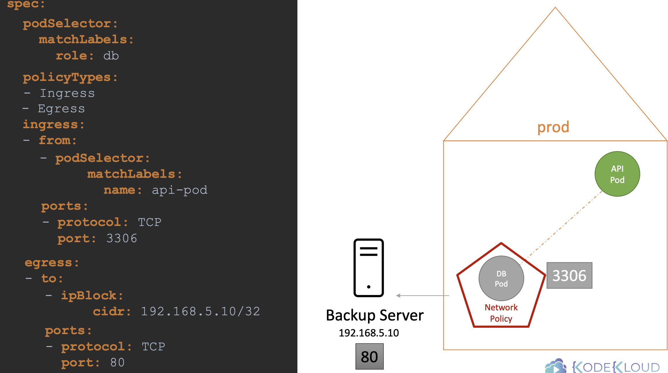 이제 네임스페이스 셀렉터를 다시 prod로 변경하고 다른 사용 사례를 살펴보자. 예를 들어 Kubernetes 클러스터 외부에 백업 서버가 있고 이 서버가 데이터베이스 포드에 연결되도록 허용하려고 한다. 이제 이 백업 서버는 Kubernetes 클러스터에 배포되지 않았으므로 트래픽을 정의하는 데 사용하는 포드 선택기 및 네임스페이스 선택기 필드는 클러스터의 포드가 아니기 때문에 작동하지 않는다.