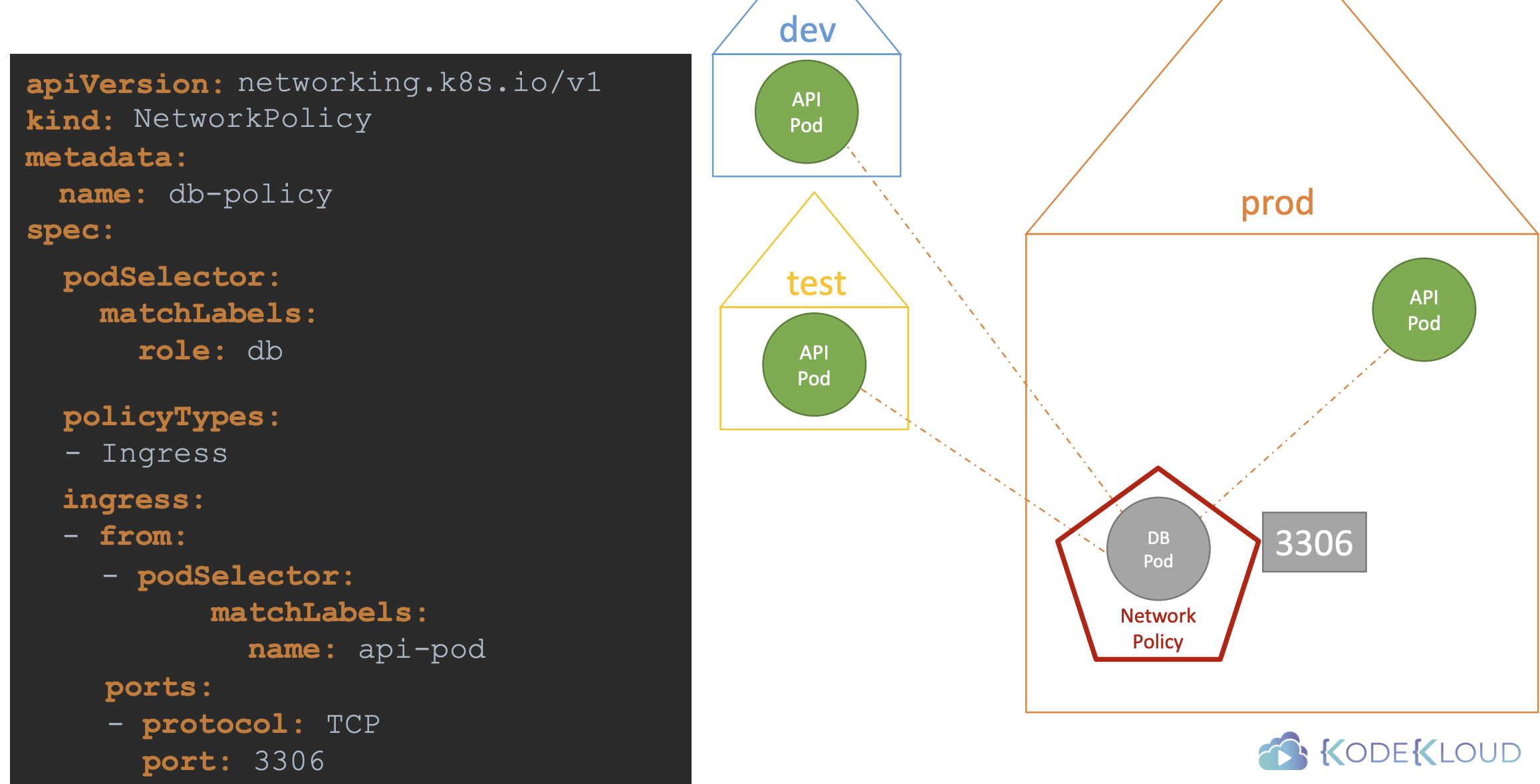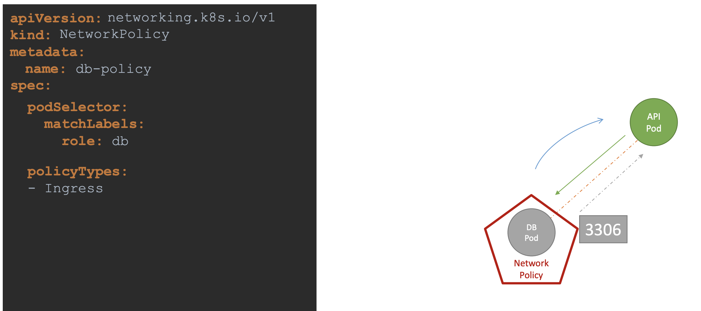 그러나 우리는 포트 3306에서 데이터베이스를 쿼리할 수 있으려면 API 포드가 필요하다. 여기에서 Ingress(수신) 및 Egress(송신) 가 둘 다 필요할까? DB Pod 관점에서 보면 API Pod 에서 들어오는 트래픽을 허용하려고 한다. 수신이므로 Ingress가 필요하다. API Pod는 데이터베이스 쿼리를 생성하고 데이터베이스 Pod는 결과를 반환한다. 결과를 API Pod 로 돌려 보내려면 별도의 규칙이 필요할까? 아니다. 들어오는 트래픽을 허용하면 해당 트래픽에 대한 응답 또는 응답이 자동으로 다시 허용된다. 그래서 이 경우에는 API Pod에서 데이터베이스 Pod로의 트래픽을 허용하는 Ingress 규칙만 있으면 API 포드가 데이터베이스에 연결하여 쿼리를 실행하고 쿼리 결과를 검색할 수 있다.